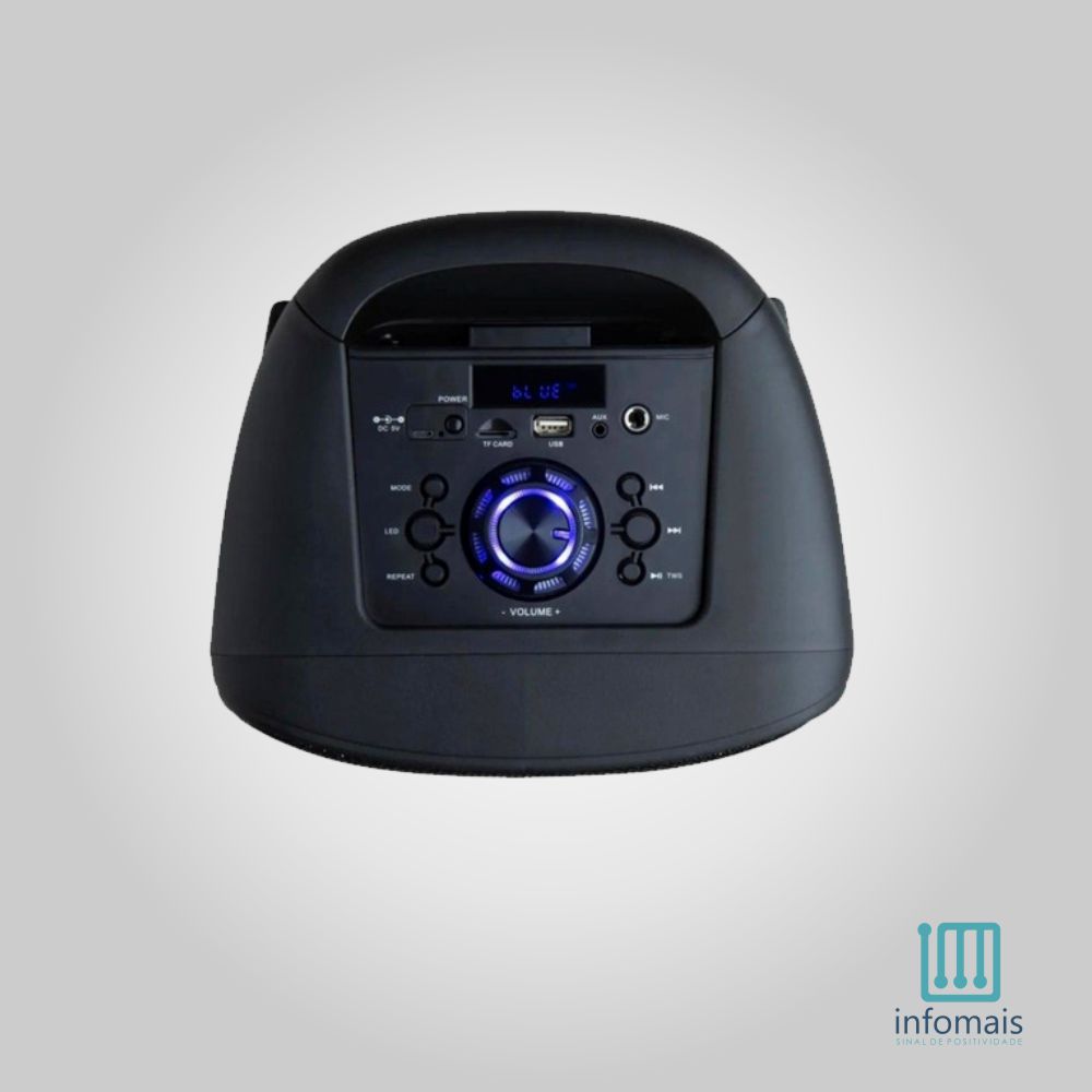 Reproduz música através de Bluetooth, pendrive, cartão de memória ou entrada auxiliar (P2), além de possuir rádio FM e entrada para microfone.